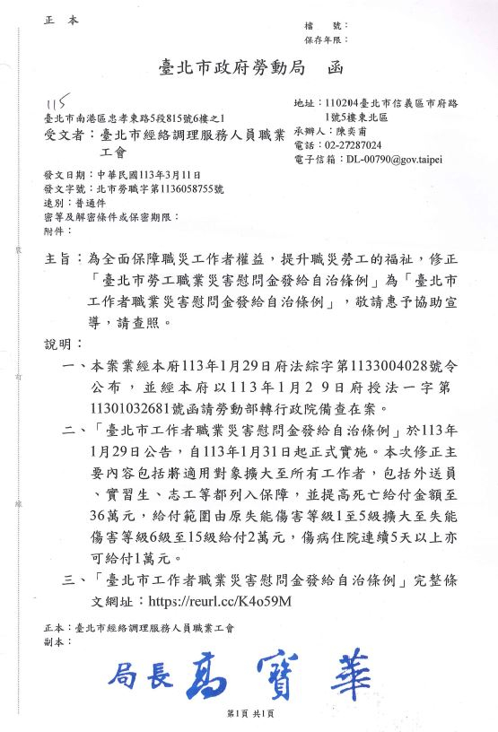 臺北市工作者職業災害慰問金發給自治條例 完整修文網址: