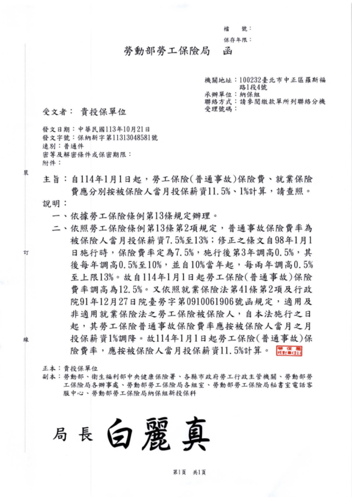 114年度勞保普通事故費率調高至11.5%。(轉自勞工保險局)