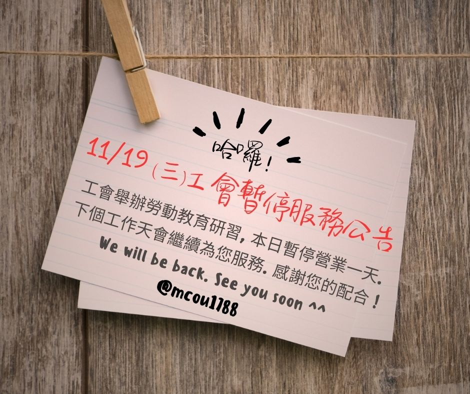 2025 /09 /11 [公休公告] 配合勞教研習活動,本會11/19公休一日。 本會於114年11日19日舉辦勞動教育研習活動,活動當日辦公室公休一天。 公休期間不受理勞健保加退保申請,若有任何要諮詢的事項,可以於工會官方line帳號中留言,我們會在下個工作日盡快為您處理。 工會官方 Line ID : @141umauc 附件圖檔