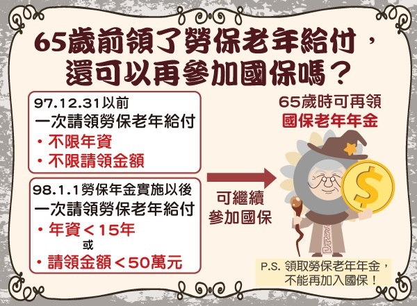 2022 /09 /29 勞保退休了,還可以保國民年金嗎? (摘自勞工保險局臉書) 領取勞保老年年金者 (月領) >> 雖未滿65歲,均不具參加國民年金資格 一次請領勞保老年給付者 (一次領) >> 98.1.1前請領者,均可參加國民年金至65歲 98.1.1後請領者,所領取的金額少於50萬 或 退休時總年資少於15年者,均可參加國民年金至65歲 己領取相關社會保險老年給付(如:公教人員保險養老給付、勞工保險老年給付及軍人保險退伍給付) 112年10月1日(含)以後(國民年金法施行15年後),領取相關社會保險老年給付者,不得再參加國民年金保險。 附件圖檔