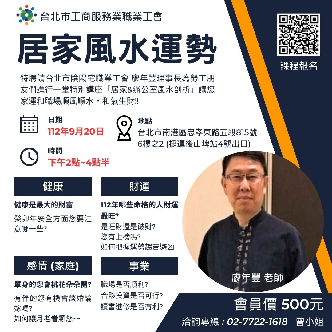 本會的姊妹工會-台北市工商服務業職業工會 特聘請台北市陰陽宅職業工會 廖年豐理事長為勞工朋友們進行一堂特別講座「居家&辦公室風水剖析」讓您家運和職場順風順水,和氣生財!!