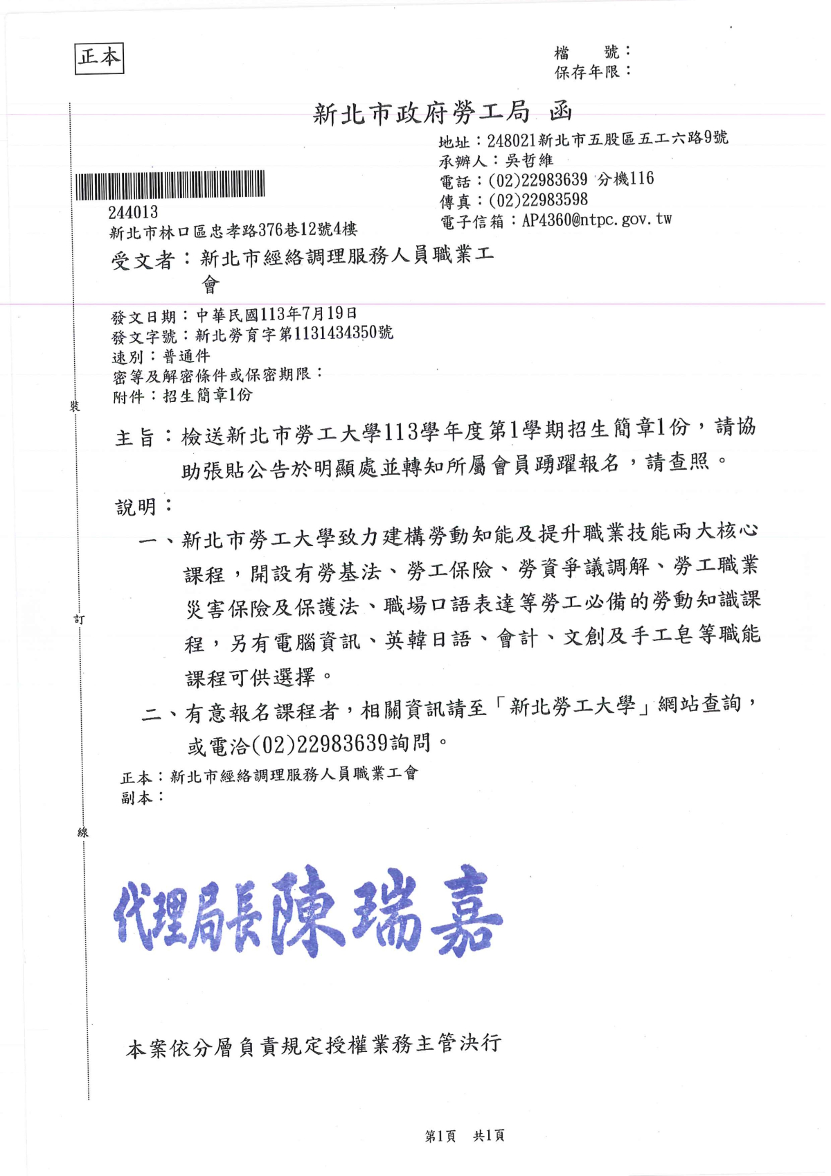 新北市勞工大學113年度招生簡章。(轉發新北市政府勞工局公告)
