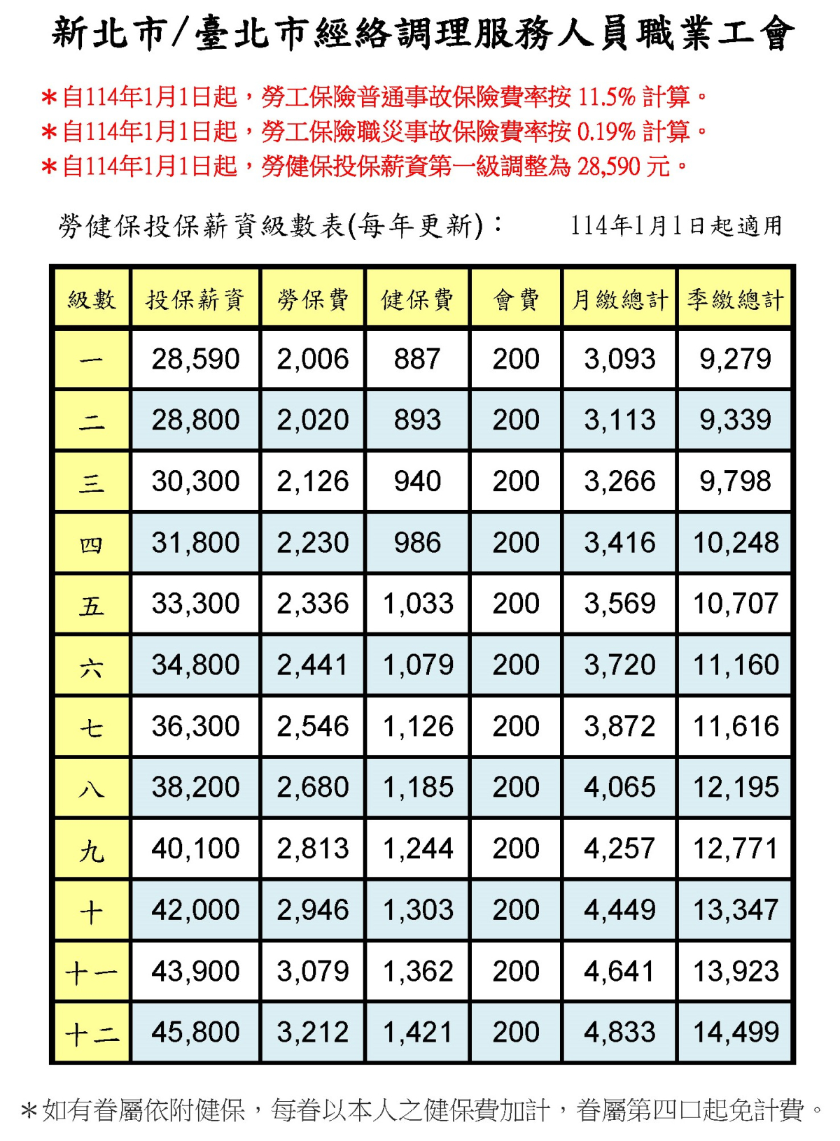 * 114年度投保薪資級距表與對應保費金額請洽本會官網: 投保薪資級距表