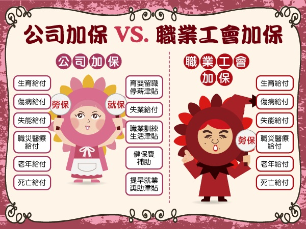 不論是在公司加保勞保或在職業工會加保勞保,享有的勞保給付權益都是一樣的,生小孩可以領生育給付、退休後有老年給付…等。