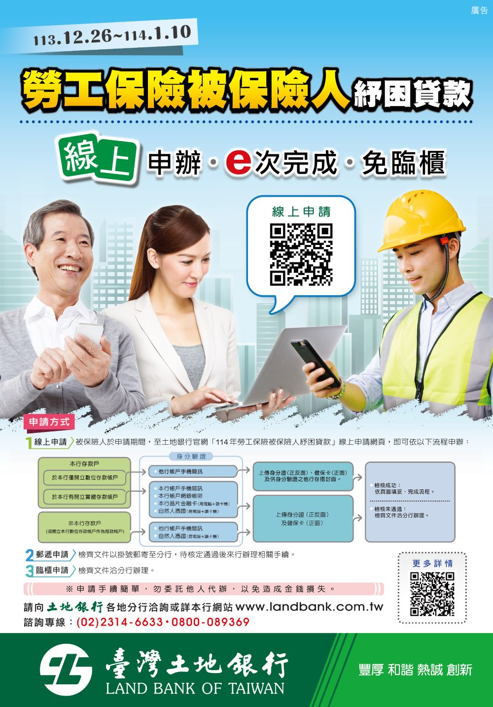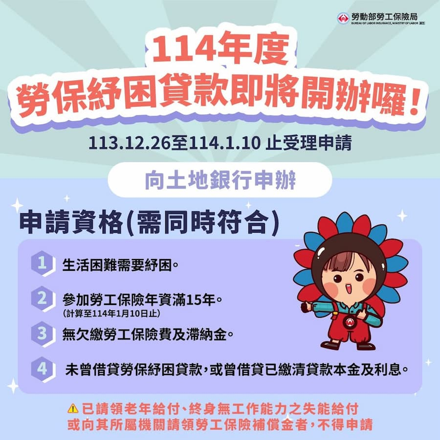 114年勞保紓困貸款將於113年12月26日開辦!(轉自勞工保險局)