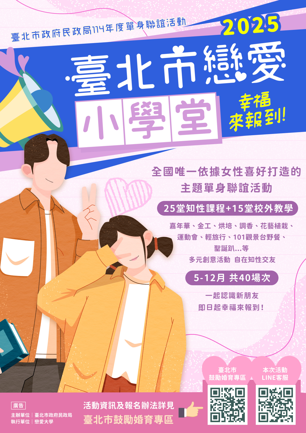 轉知民政局辦理114年度單身聯誼活動「2025臺北市戀愛小學堂—幸福來報到!」