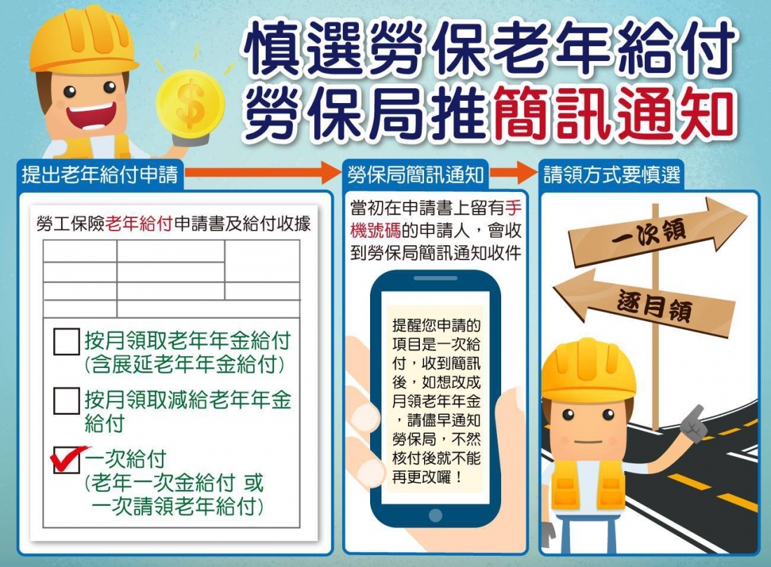 2022 /09 /29 慎選勞保老年給付方式,核付後即不可更改。(轉自勞保局臉書) 勞保局針對請領勞保老年一次給付的人,勞保局在收到您的申請書後會有簡訊通知喔! 收到簡訊後,如想改成月領老年年金,務必立即通知勞保局,不然核付後就不能再更改了~ 附件圖檔